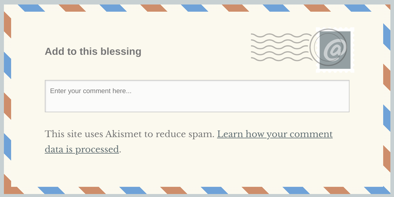 The last week of September 2019 it seemed that God was asking me to pray 40 blessings over everyone at The River Food Pantry. He even provided the basis for the blessings! Initially I was praying a blessing over everyone at the River at the start of the Friday evening meal. Now, with the Stay At Home situation, I will be praying a blessing over everyone each day, starting on April 6. There will now be a daily blessing posted on this website each day at one minute past midnight. You are welcome to add to the blessing as a comment/reply. To do so, just click on the blessing, then when it is displayed scroll way to the very bottom where you will see what looks like an air mail envelope … just type your addition to the blessing in the text box inside that envelope and Air Mail it! It will look like this: